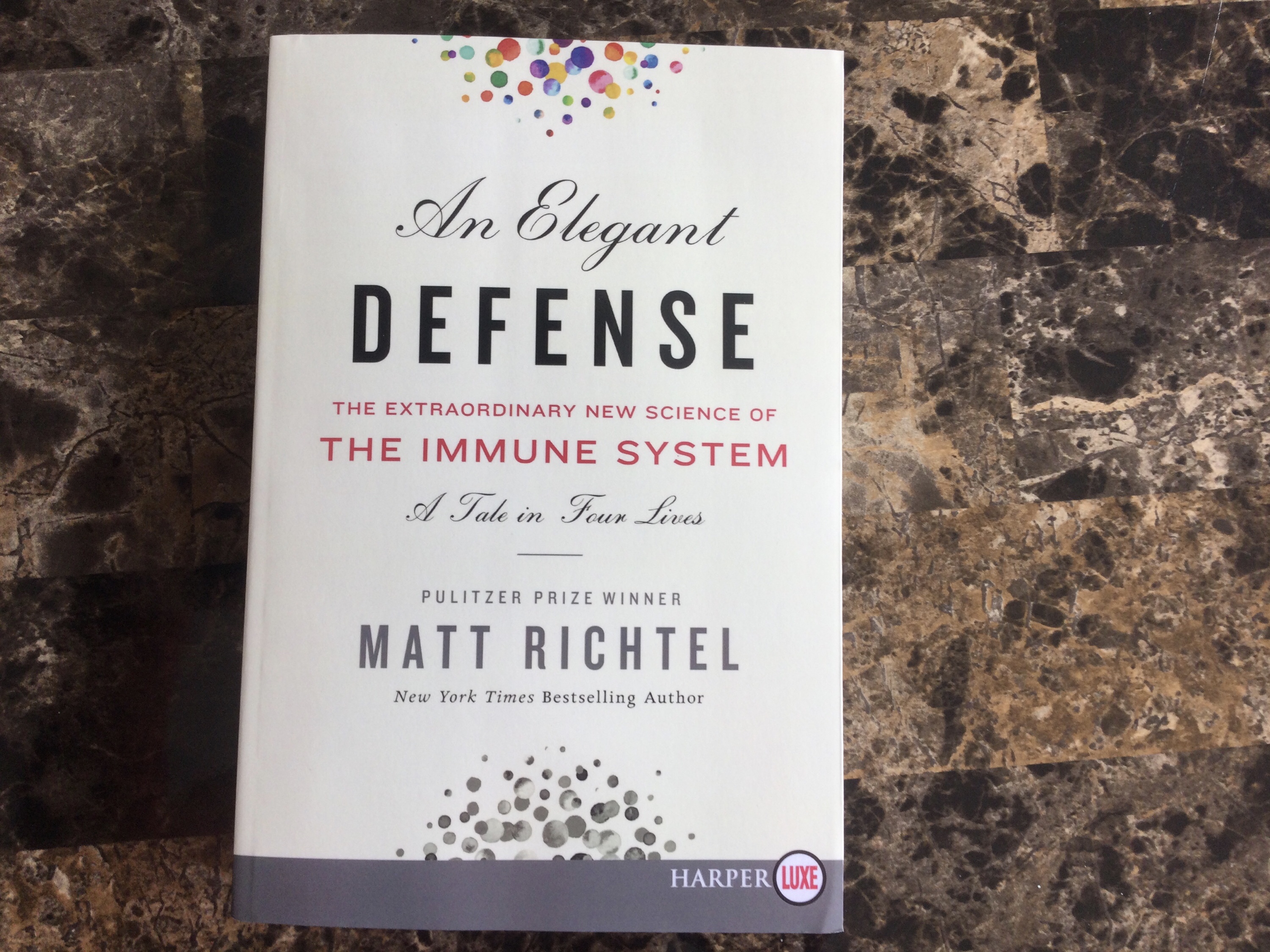 An interesting layman’s review of discoveries in the world of immunology, this well-researched tome by a New York Times columnist was a Father’s Day gift. Using almost entirely military analogies, the complex players protecting and sometimes disrupting the “Festival of Life” are attributed intentionality and the ability to calculate mathematical odds, in their efforts to protect us from infections, injuries and cancers.